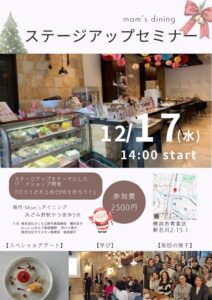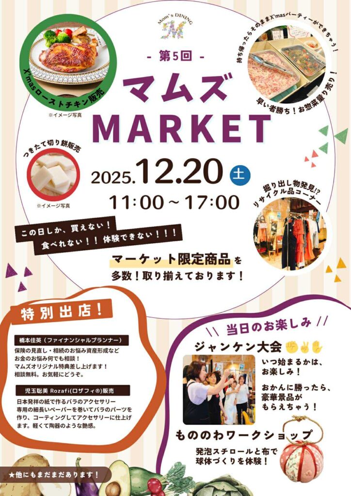 12/20(土)マムズマーケット開催! 投稿日 2025年12月9日 著者 suzuichi カテゴリー Mom'sダイニング カテゴリー イベント情報 マムズのスタッフがそれぞれのスペシャルスキルを発揮してサービスを提供するマムズマーケットを開催します。 この日しか販売されない食品、ハンドメイド商品や体験を多数ご用意!今回は2店舗特別出店による当日限定のアクセサリーやお花の販売があります。毎回盛り上がるじゃんけん大会も開催!是非、お気軽にご来店ください。 日時:12月20日(土)11:00~17:00参加費:無料お問合せ:045‐884‐8446(マムズダイニング)