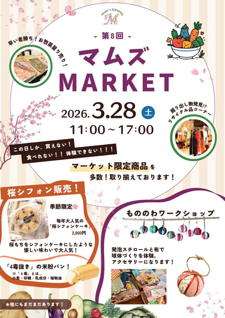 今回も特別出店とスタッフからの出店があります。また、マムズダイニングからは、数量限定で『4毒抜き』(小麦・卵・白砂糖・乳成分なし)の米粉パン(1本税込780円)や季節限定の桜シフォンケーキ(2000円)を販売します。