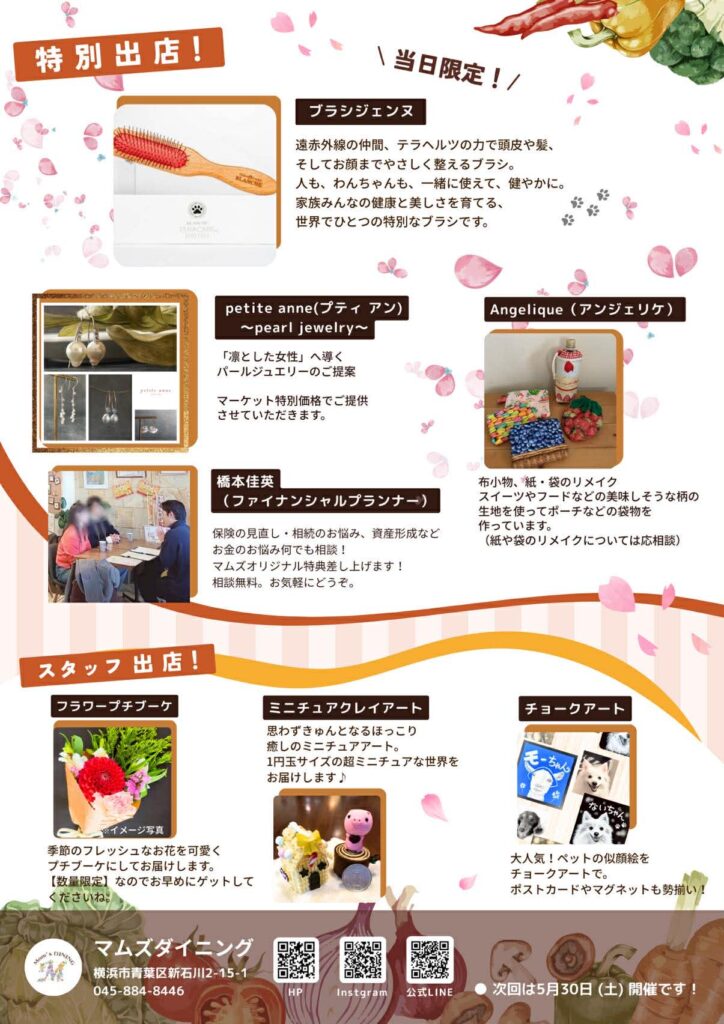 マムズのスタッフがそれぞれのスペシャルスキルを発揮してサービスを提供するマムズマーケットを開催します。